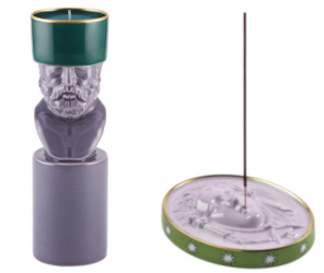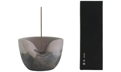 From Obakki in Canada, an incense gift set: "We think these incense burners are the answer to all your incense needs - with a deep bowl that you can fill with sand or pebbles to create a heat resistant base and a high back wall that acts as a windbreak, these stunning pieces can do it all. Made OF Australia's signature series of functional stoneware ceramics - twice fired, once to full vitrification for durability and longevity, then again while sealed in special containers (called saggars) with native Australian flora and organics from indigenous fauna (organic materials like snakeskin, emu and crocodile eggshell, and goose feathers etc.)." Comes with a Waboku incense sampler ("The Hinoki (cypress) is a calm and soothing aroma, the Keyaki (delvoka) is a sweet and exotic scent, uplifting -- and the Kusonoki (camphor tree) is uplifting and powerful.") $131 USD.