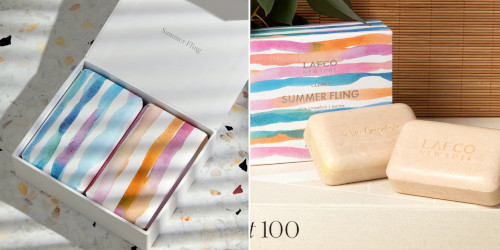 A lemmable summer hostess gift? From Lafco, the Summer Fling soap duo. "This cheerful, summer-inspired, limited-edition gift set contains two luxurious, ultra-hydrating, palm oil-free natural bar soaps delicately fragranced with LAFCO New York's citrusy fan-favorite White Grapefruit scent. These olive-oil bar soaps are further infused with rosehip powder to replenish skin after a day at the beach. White Grapefruit is an exhilarating blend of pineapple and grapefruit nestled on a bed of green fern and mandarin leaves. The refreshing scent is warmed by sumptuous notes of apple wood and orange blossom." $32 at Neiman Marcus.
