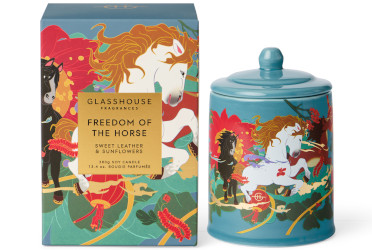 More Year of the Horse…from Glasshouse, the limited edition Freedom of the Horse candle: “This Lunar New Year, we celebrate the dynamic spirit of the Fire Horse; a symbol of independence, strength, and renewal. Our limited-edition fragrance, Freedom of the Horse, blends the mystical intensity of sweet leather and incense with the vitality of sunflowers and yellow rose.” 380g for $60 at Glasshouse, where you’ll also find a horse candle holder (shown below the jump) sold separately for $65…