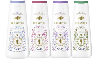 While you're waiting for Season 4, Dove Beauty suggests their Bridgerton collaboration, with four limited edition fragrances: Love & Meadows, Moonlit Masquerade, Raspberry Rendezvous and Whispering Wisteria. Shown is a Body Wash bundle with all four scents for $30. At Target, where you'll also find Dove + Bridgerton body scrub, body mist, hand wash, antiperspirant and bar soaps.