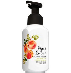 From Bath & Body Works, Peach Bellini Gentle Foaming Hand Soap: "A delicious twist of juicy peach, white apricot & fresh mango. Our Gentle Foaming Hand Soap with white tea & ginseng extracts delivers a cloud of luxurious foam that transforms into a rich, creamy lather to gently wash away dirt and germs, while soothing Aloe and nourishing Vitamin E leave hands feeling soft and smooth." $6.50 for 259 ml.