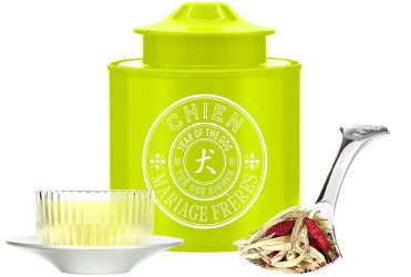 Year of the Dog tea from Mariage Frères: "...a wonderful organic imperial white tea made of beautiful silver needles perfectly married to the precious notes of organic citrus. Goji berries, signature of the collection THÉ DES SIGNES, bring their fruity notes and revitalizing effects to this gourmand blend. Lime green in colour, a beautiful pagoda shaped tin houses this adorable THÉ DES SIGNES – YEAR OF THE DOG." 30g for €26.