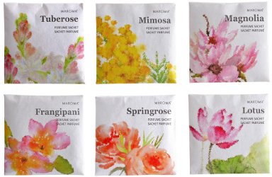 The budget perfumista's alternative to yesterday's spendy thingamabobs: Maroma's flower sachets, in Tuberose, Mimosa, Magnolia, Frangipani, Springrose and Lotus. $4.20 each at Smallflower.