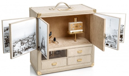Memo celebrates its 10th anniversary with a limited edition music box displaying a bottle of Eau de Memo: "A trunk of secrets, a whisper of leather. Frivolous treasures tucked away in curious drawers. A flash of blue feathers, a forgotten melody. Flapping wings over the rooftops of Paris. A bottle, as if in flight, kept away from prying eyes. Cloaked in embossed beige leather, this music box commemorating the 10th anniversary of Memo Paris houses a bottle of Eau de Memo alongside singing automated birds. Reuge, the Swiss watchmaking specialist, is the skilled manufacturer behind this limited-edition gem with a visible automatic movement that transforms the music box into a genuine treasure chest." Special order, requiring 3 months lead time, price (blissfully) unknown.