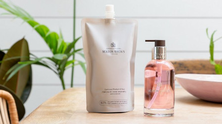 Molton Brown has introduced refill pouches for their hand wash and shower gels in selected fragrances; shown is the refill for Delicious Rhubarb & Rose hand wash: "A bestselling Fine Liquid Hand Wash in a more sustainable Refill pouch. Deliciously scented with notes of tart rhubarb, rose extract and a citrusy twist of grapefruit, this pouch reduces single-use plastic and waste, using 63% less plastic to make compared to our standard bottles". $35 for 400 ml (the 300 ml glass pump bottle is $30).