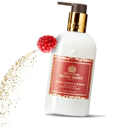 From Molton Brown, the holiday collection for 2022 includes the limited edition Merry Berries & Mimosa fragrance, shown here in Body Lotion: "Merry Berries & Mimosa Body Lotion is infused with delectable red berries, soft mimosa, and ripe raspberry. Moisturize winter skin after a bath and look forward to happy festivities." $46 for 300 ml at Saks Fifth Avenue.