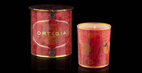 From Ortigia, the Melograno candle: "A decorated glass candle jar of wax infused with the crisp dry pomegranate perfume." Available in 150g ($36) or 380g ($68) at 50 ml US.