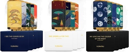 Floraïku fragrances are arranged in groupings: Forbidden Incense | Kodo — Sound of a Ricochet, My Shadow on the Wall, My Love Has the Color of the Night; Enigmatic Flowers | Ikebana — I See the Clouds Go By, Cricket Song, First Dream of the Year; Secret Teas and Spices | O Cha — The Moon and I, I Am Coming Home, One Umbrella for Two; Light Shadow — Sleeping on the Roof; Dark Shadow — Between Two Trees. Each scent has a poem attached to the perfume and comes in a gorgeous bottle/10 ml travel spray combo (presented in a bento box). Eight of Floraïku’s perfumes are missing from my two posts this week: Just A Rose, Ao, The Mountain Standing Still, Flowers Turn Purple, In the Rain, Wind in my Hand ($755!), In the Dark and Surprise…