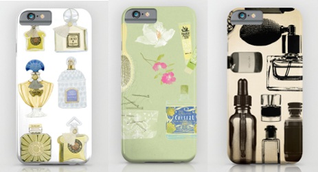 Three of the many perfume-related iPhone cases at Society6: "Guerlain Perfumes", "Girl Stuff" and "Sepia". $28 each.